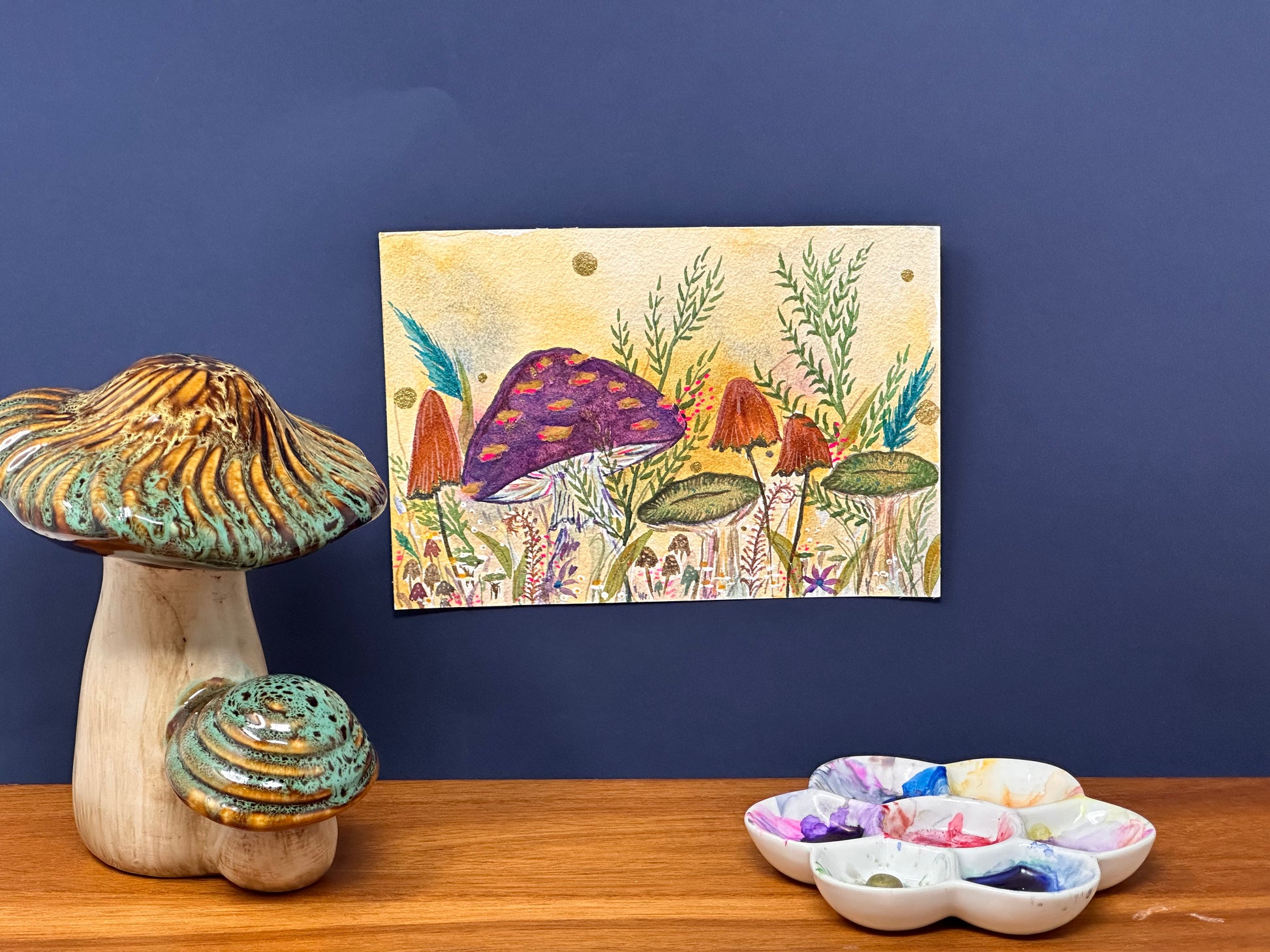 This 5x7 inch mushroom painting is painted on 100% cotton paper with professional grade watercolor. With a beautiful gold sparkle it is sure to add some magic to your day.