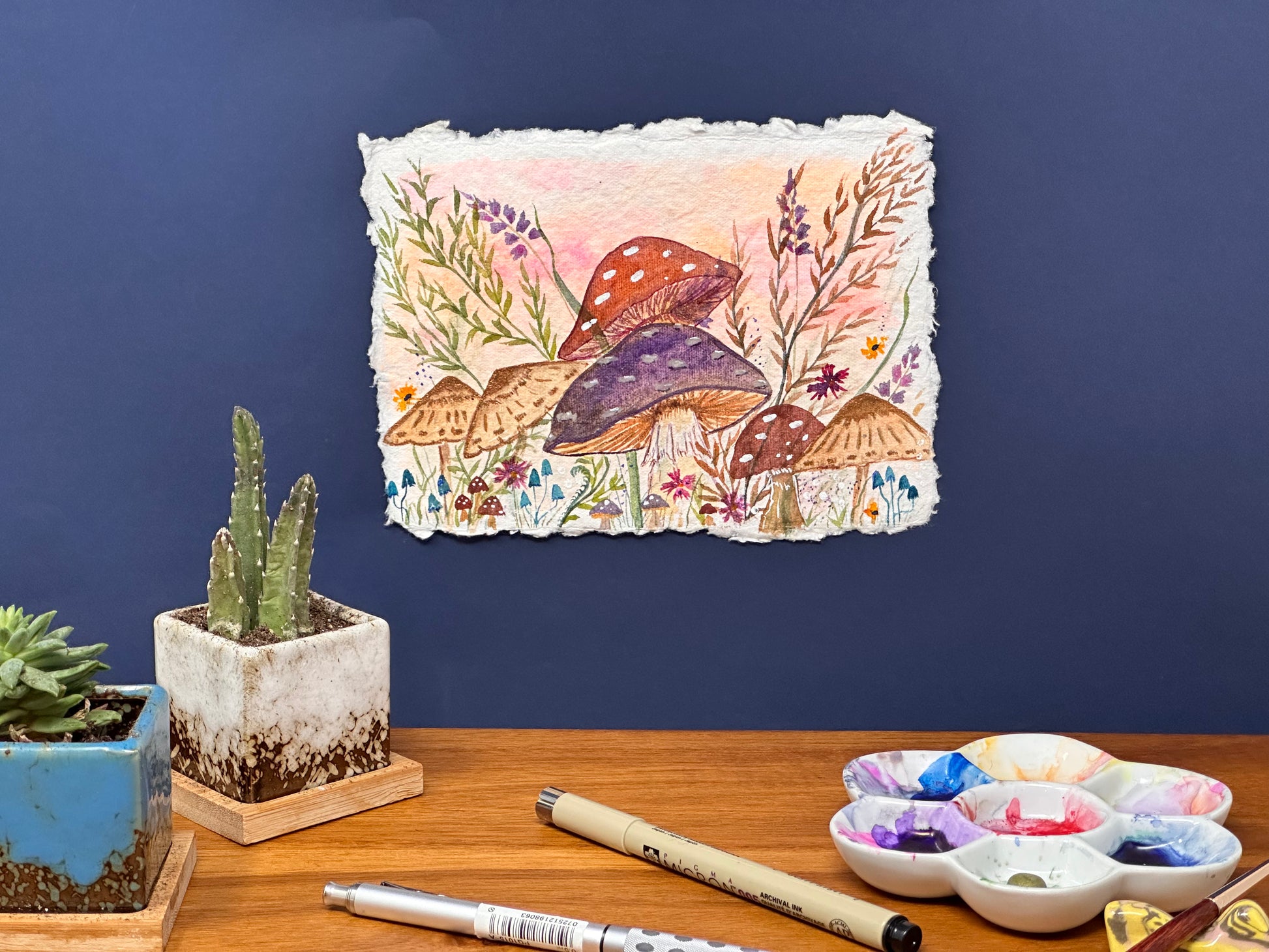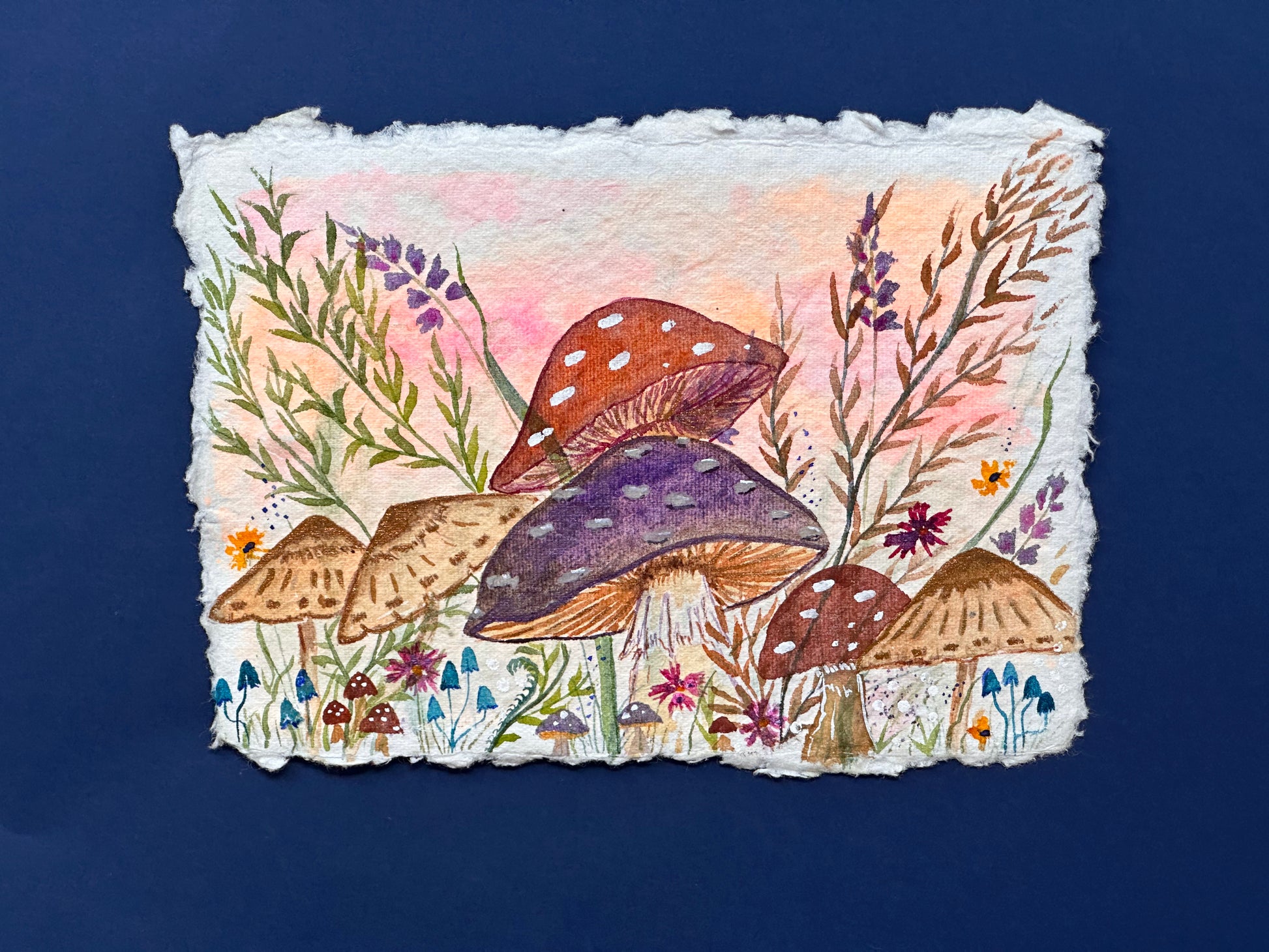 This 7x5 inch mushroom painting is painted on 100% cotton paper with professional grade watercolor. The deckled and irregular edges add to the charm of the magical mushrooms.