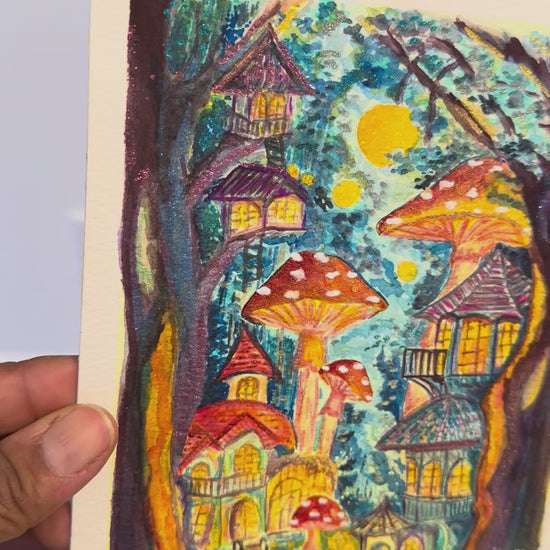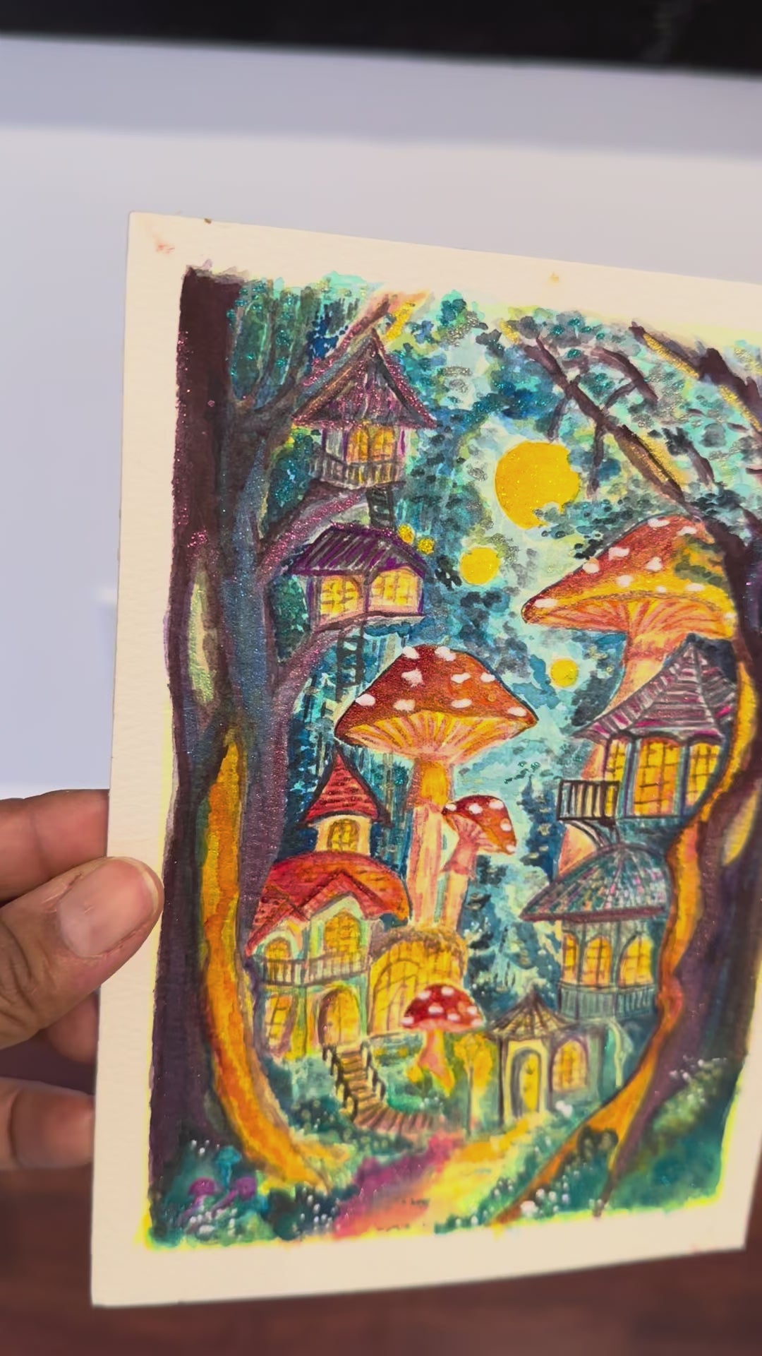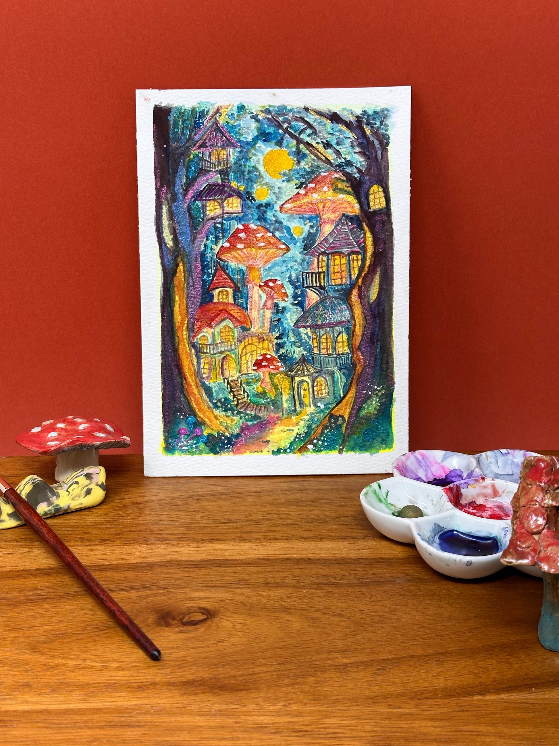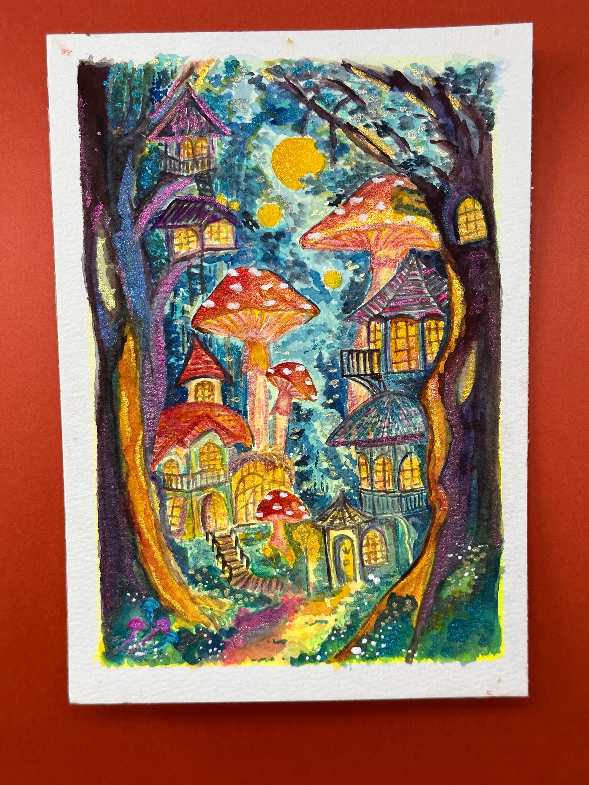 Painted professional grade watercolor and handmade sparkle paint. The first magical neighborhood created by me. Who knew I would be a real estate developer?