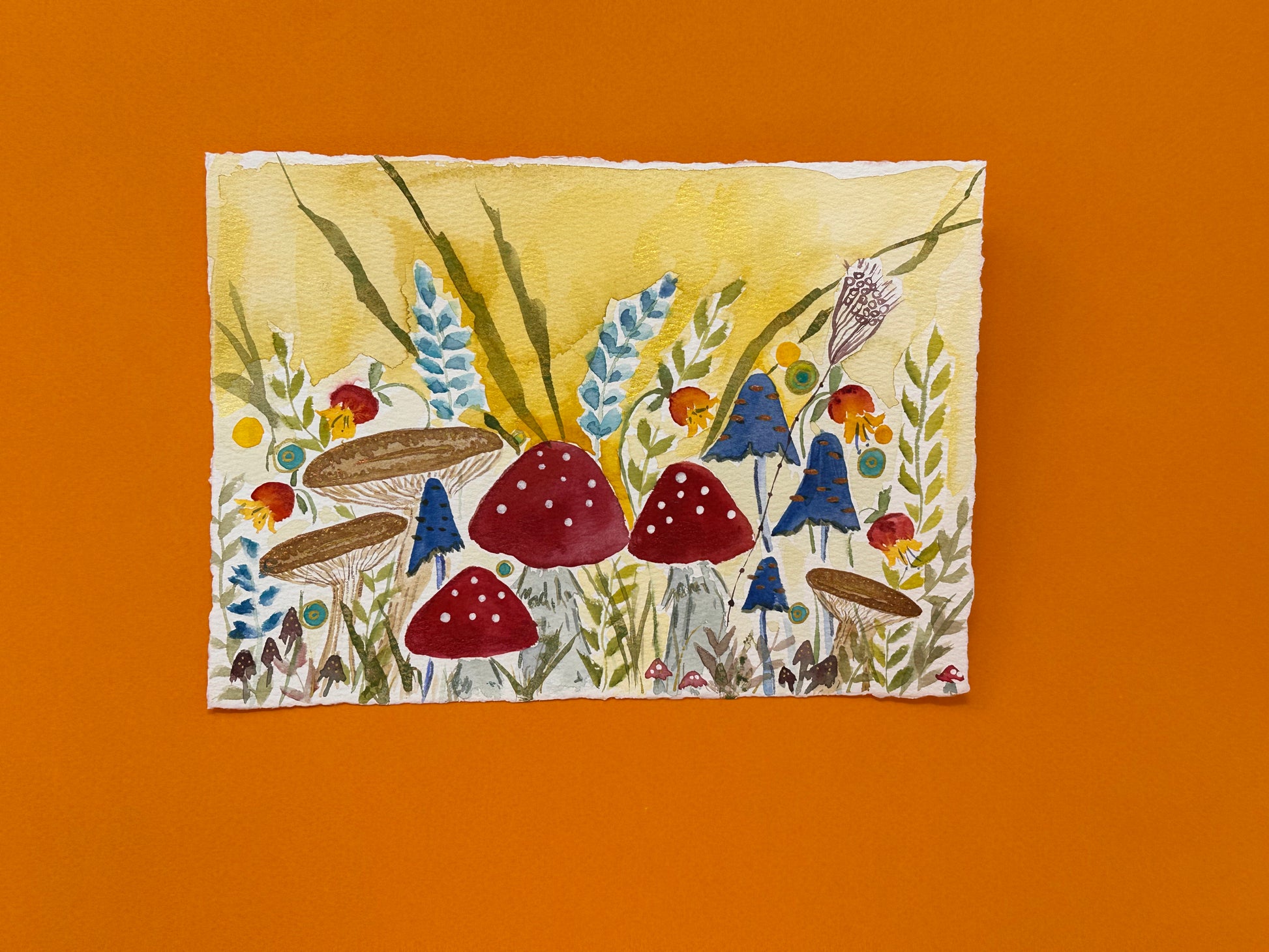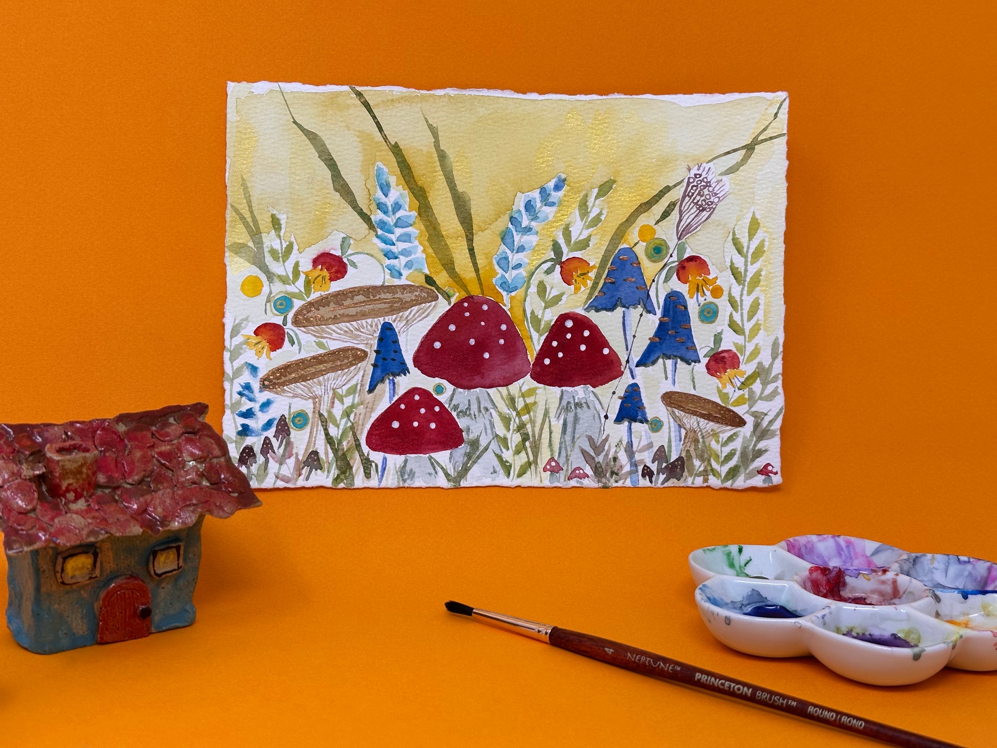 This unframed watercolor art 8x6 inch mushroom painting is painted on 100% cotton paper with professional grade watercolor. The deckled and irregular edges add to the charm of the magical mushrooms.