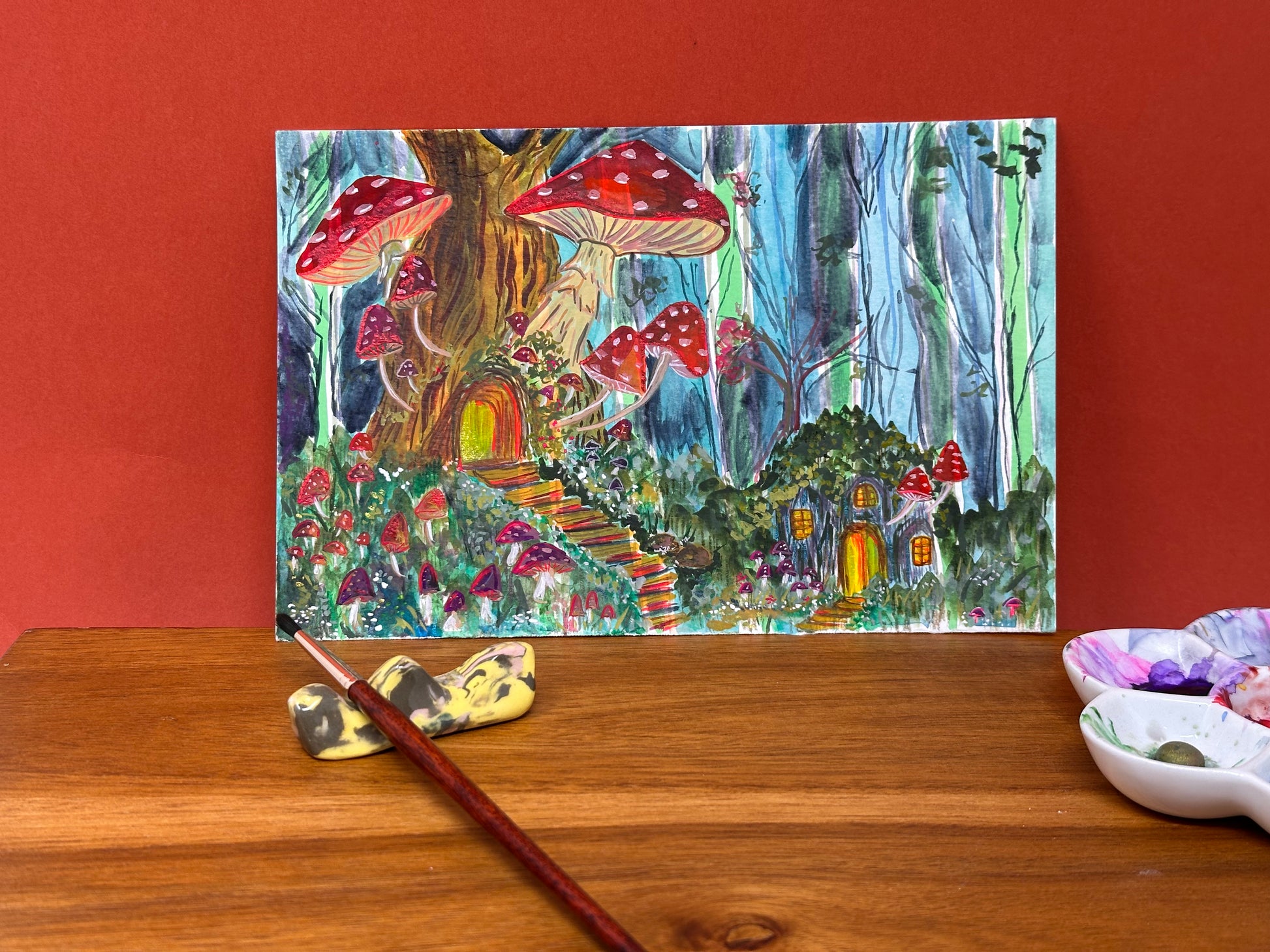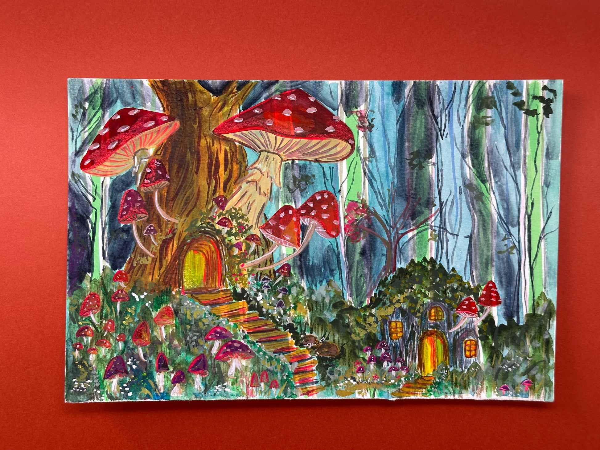 As the bright colors in this painting are dye based it is recommended it be displayed away from direct light.